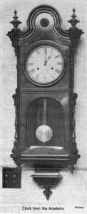 Kenneth “Eck” Thrailkil was the first caller. He informed me he had a clock that was salvaged from the fire that destroyed the college. The accompanying photo shows the old clock, which is 41″ high and 15″ wide. When I visited the Thrailkils it was still ticking away.